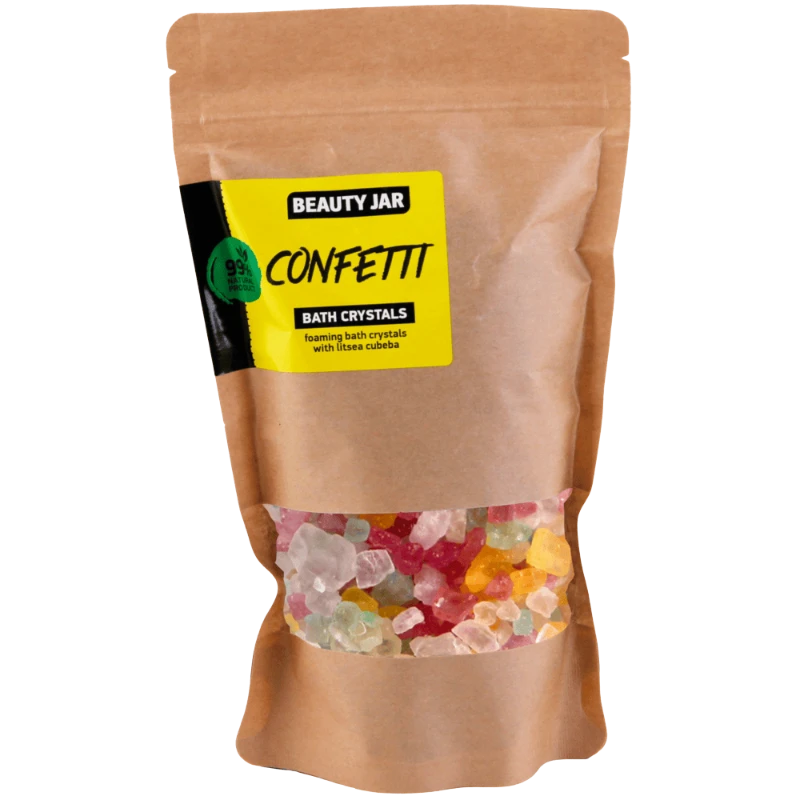 A Beauty Jar Confetti pezsgő fürdőkristályokat azoknak alkották, akik szeretik a kényelmes, pihentető és egy kicsit vidám fürdőzést. A sós fürdő segít csökkenteni a fáradtságot, megnyugtatja a testet és javítja a közérzetet.