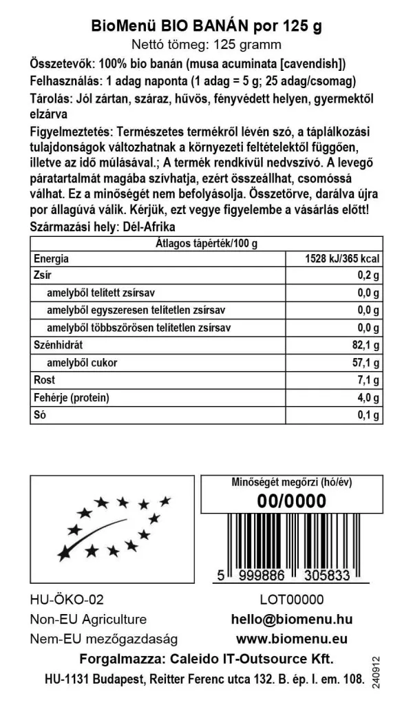 A BioMenü BIO Banánpor különösen sokrétűen használható, egész évben elérhető termék. Magas energiatartalmú tápanyagbázist jelent, amely egészséges módon járul hozzá a szervezet feltöltéséhez. Kiemelkedő antioxidáns-forrás, káliumban, kalciumban és magnéziumban gazdag, valamint rendkívül magas a rosttartalma.