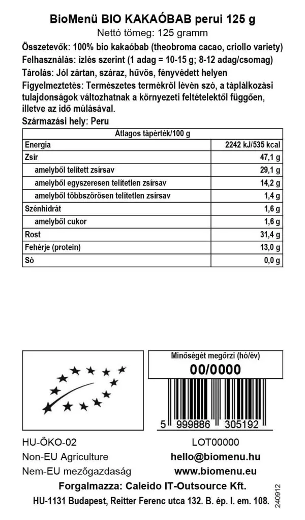 BIOMENÜ BIO Perui Egész Kakaóbab