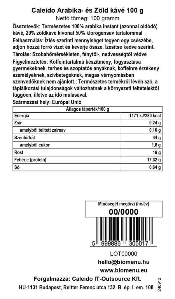Zöldkávé-kivonatot tartalmazó, természetes, 100% arabica instant kávé.