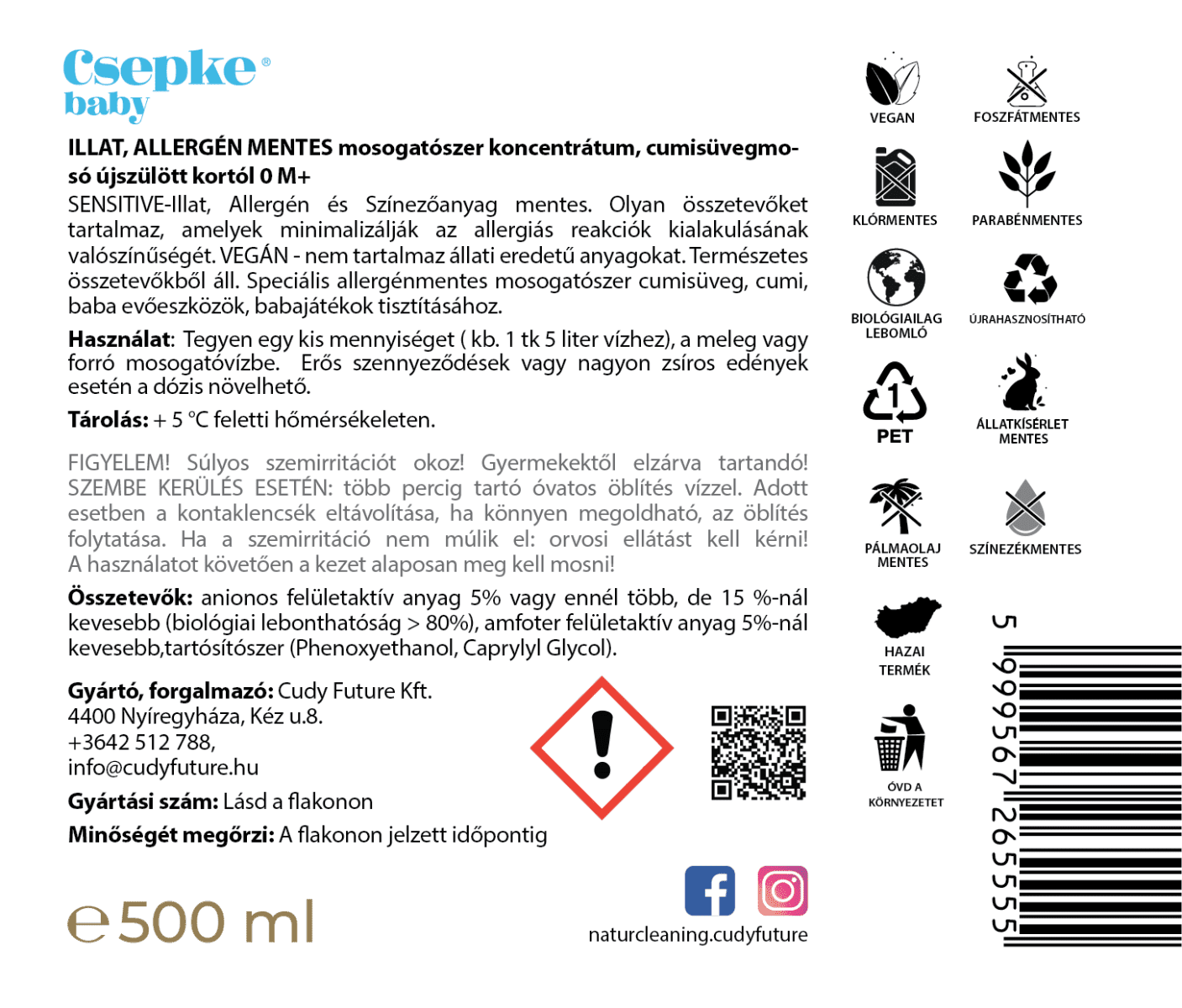 A Csepke Baby mosogatószer úgy készült, hogy már újszülött kortól biztonsággal tisztíthassuk vele a baba eszközeit, mindenféle vegyi vagy allergén anyag nélkül. Speciális, allergénmentes formula cumisüvegek, cumik, baba evőeszközök és babajátékok tisztítására.
