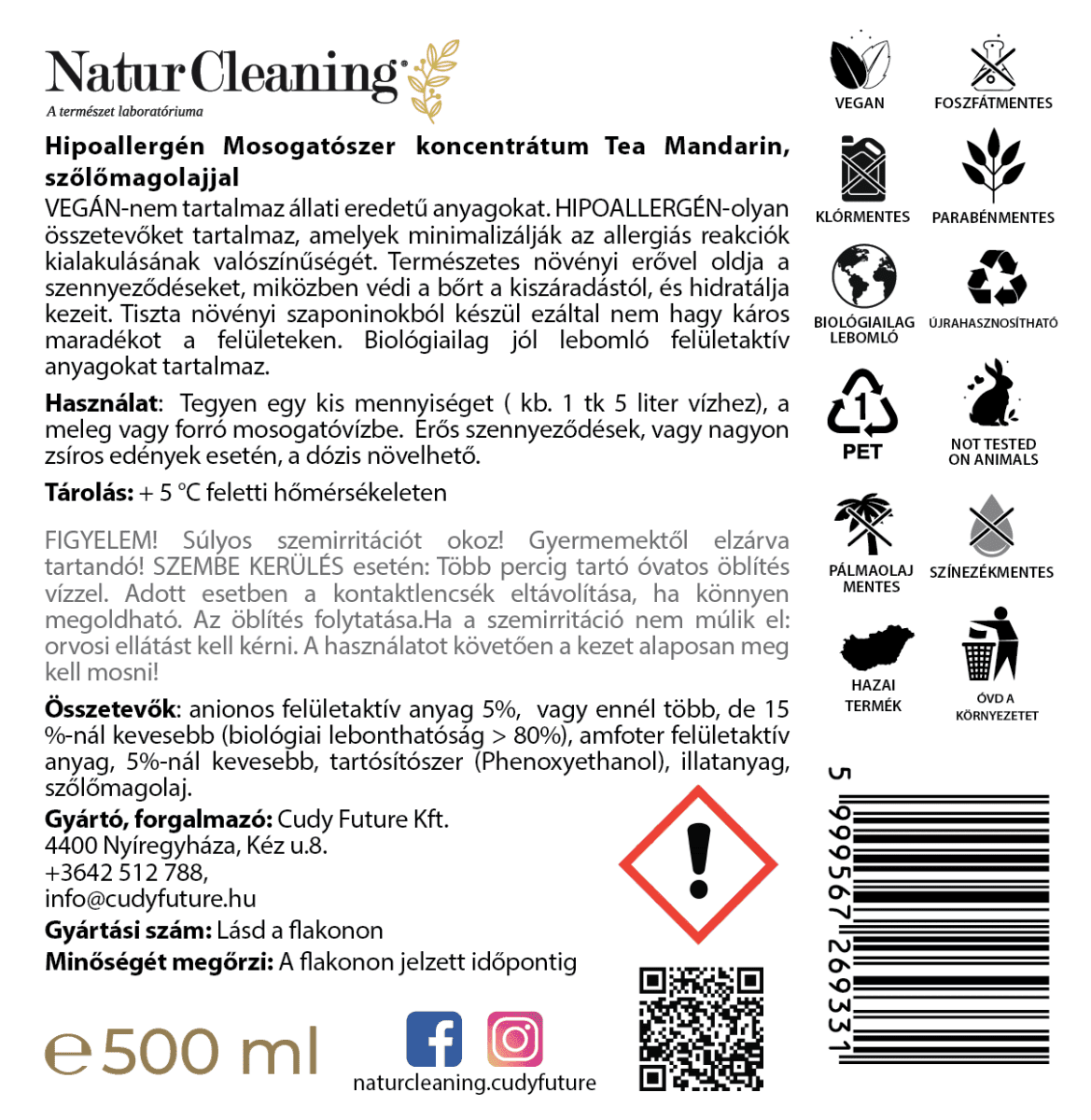 A Naturcleaning Tea–mandarin mosogatószer koncentrátum foszfát-, klór- és parabénmentes, vegán, állatkísérlet-mentes formula kézi mosogatáshoz. Természetes növényi alapanyagokból (kukoricaolaj, kókuszolaj) készült, és biológiailag jól lebomló felületaktív anyagokat tartalmaz, így kíméli a környezetet.