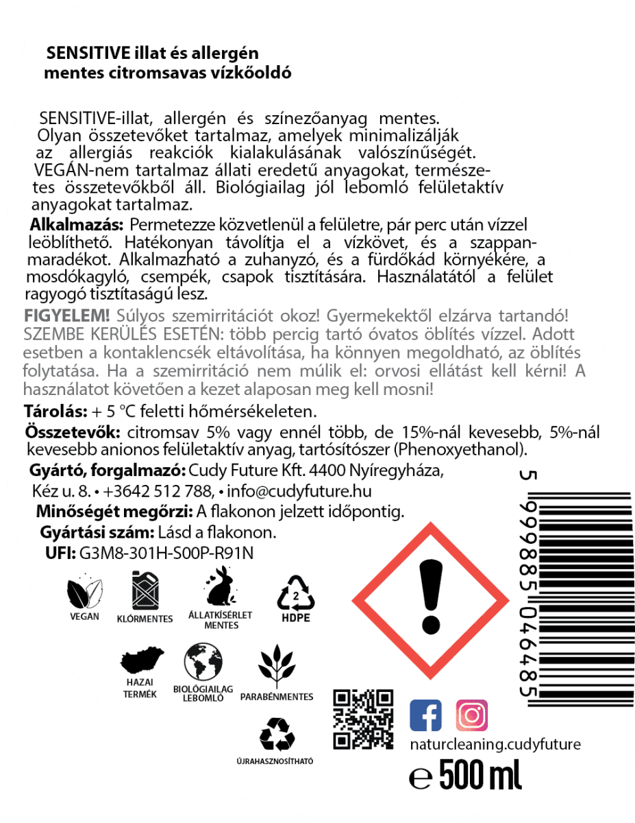A Naturcleaning Sensitive vízkőoldó spray a citromsav természetes erejével távolítja el a vízkövet és a lerakódásokat. Illat- és allergénmentes formulája kifejezetten érzékeny, allergiára hajlamos felhasználóknak készült, mégis hatékony tisztítást biztosít a mindennapokban.